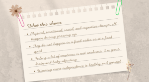 When we talk about growing up, we usually mean changes happening across four areas of life — sometimes all at once, which is why it can feel like a lot.